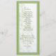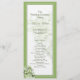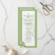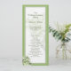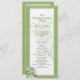 Modelo do programa de casamento verde e branco, alto é fácil de personalizar de ambos os lados. Modelo para os nomes, o local (e a hora, etc.) do casamento e a ordem da cerimônia estão na frente, com mais duas áreas de modelo e um lugar para adicionar uma nota de agradecimento. Ambos os lados estão decorados com flores de hydrangea no fundo e uma borda verde. A frente tem uma imagem floral no canto inferior. O texto é verde-escuro impresso exceto os nomes da noiva e do noivo, que são um roteiro elegante.