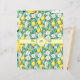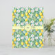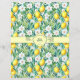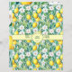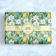 Um invólucro para sabão feito à mão, com limões, flores brancas e folhas verdes.