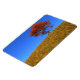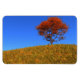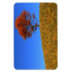 Uma paisagem 3D pacífica no outono, criada em Vue. Em cima de uma colina coberta por ouro alto, contra um céu azul claro, um mapa solitário de laranja se posiciona com uma bancada de madeira embaixo dela para parar e descansar.