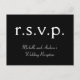 Este design de cartão postal R.S.V.P. limpo e elegante apresenta a mensagem "r.s.v.p." na frente, juntamente com um nome de evento personalizado. Ele também apresenta um formulário de RSVP personalizado na parte traseira para que o destinatário seja concluído, juntamente com um endereço personalizado ao qual as placas de RSVP completadas seriam enviadas. Cartões de RSVP como este podem ser usados para descobrir quem vai participar de uma festa de formatura, de uma recepção de casamento, de uma festa de aniversário de casamento, de uma festa de janto, ou de alguma outra celebração.