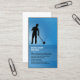 Neste cartão de visita de Serviços de Limpeza, a silhueta de um homem usando um esfregão forma a imagem principal sobre um fundo azul gradiente listrado. Personalize este cartão imediatamente com seu nome e detalhes.