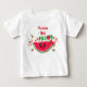 É uma linda e fofa camisa de bebé para o 1º aniversário de menina com tema de melancia "Uma em uma Melancia". O design apresenta um rosto de desenho animado sorridente e engraçado em uma fatia de melancia 🍉 com laço rosa 🎀, corações vermelhos e verdes 💕 e o nome da menina personalizado. Você pode facilmente alterar o texto e a cor clicando na opção de personalização.