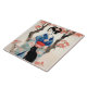 Azulejo cerâmico em um retrato de uma linda garota japonesa em um quimono florado, com um gatinho preto, e um fundo de cerejeiras