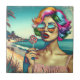 Mulher retrógrada de óculos de sol com cabelo colorido e um pirulito com fundo de praia em cores psicodélicas.