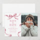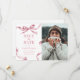 Anuncie sua formatura com um estilo atemporal usando este elegante anúncio de Save the Date. Com uma foto do formando em um fundo branco limpo, emoldurado por um laço de aquarela rosa e uma borda de fita, este design combina perfeitamente sofisticação clássica com charme moderno.