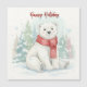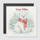 Lindo urso polar em aquarela vestindo um cachecol vermelho, sentado pacificamente na neve entre pinheiros e flocos de neve caindo. Tons pastéis suaves e um clima invernal aconchegante tornam este design encantador perfeito para cartões de Natal, votos de Natal e papelaria de temporada.