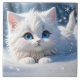 Gato branco e afável, com olhos azuis sentados na neve neste azulejo cerâmico.