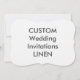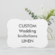 Para obter informações sobre o cheio e a gama de modelos de produtos de casamento personalizáveis, visite http://www.personalizedweddingessentials.com. Convites personalizados de casamento de LINEN - 7" x 5" - FORMA DE BRACKET. Um papel super elegante para casamentos tradicionais e ocasiões especiais. A bela textura da roupa gravada cria uma impressão sutil, mas perfeitamente eterno. 100 lb, placa de espessura de 12,5 pontos. FEITO NOS EUA. Grande economia de desconto de compra múltipla de comprar em massa em cartões de convite, até 50% das suas compras para várias encomendas de itens. Convites de Casamento Zazzle - Crie, faça, design seus próprios convites personalizados de casamento deste vazio de design de convite personalizado do Zazzle. Impressão de alta qualidade, cor de cheio, cheio de sangramento em ambos os lados com opções de impressão de ALTA DEFINIÇÃO ou Padrão. Opções de tamanho: 5" x 7", 4,25" x 5,5", 3,5" x 5", 4" x 9,25", 5,25" x 5,25", 4,5" x 6,25", 5,5" x 7,5", 6,5" x 8,75". Opções de Orientação: Vertical (retrato) ou horizontal (paisagem). Opções de acabamento: Semirbrilho, Matte, Ultra-espesso, Laid, Linen, Columizado, Felt White, Felt Ecru, Kraft, Shimmer Pérolas, Shimmer de Champanhe e Prata Metálica. Opções de Forma e Estilo de Cartão: Cantos Padrão ou Arredondados (todos os tamanhos); Colchete, Escalonado, Bilhete ou Etiqueta (apenas 5" x 7"); Circular (apenas 5,25"). Envelopes brancos padrão incluídos, com opções de upgrade. Perfeito para convites de casamento, solteira, chá de panela, janto de ensaio, salvar a data etc., e para qualquer convites de festas de RSVP, como aniversário, aniversário, 16 e Quincenera; ou para convites para eventos e exposições corporativos - para fotos, imagem, texto, noiva e noivo, ou para sua própria criação personalizada de designs.