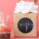 Um adesivo fotográfico redondo dos arranha-céus iluminados na linha do horizonte do centro comercial de Doha, a capital do país do Golfo Árabe, Qatar, à noite.