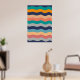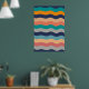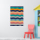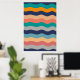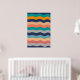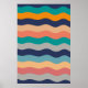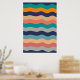 Um design com inspiração retroativa com linhas onduladas irregulares em azul marinho, turquesa e laranja.