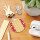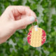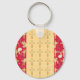 Este favor de chaveiro de casamento é decorado com cruzes cristãs de ouro e bares de damascos vermelhos e dourados num fundo de damascos.