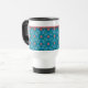 Uma Caneca de viagem chic não-derramar, com 'padrões não combináveis de lírios-d'água cor-de-rosa e lixeiras azuis; da coleção 'Lily Pond' de Posh & Painterly.