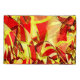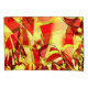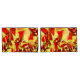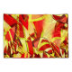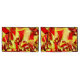 Design de bandas amareladas com alguns tons escuros ou esverdeados sobre um fundo vermelho e um efeito que simula uma chuva fina.