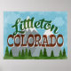 Arte de viagens vintage neo Colorado Littleton no estilo de desenho animado. Ele apresenta montanhas de neve e floresta abaixo com texto retrô divertido e feliz.