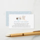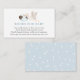 Um cartão de inserção de solicitação de livro para o chá de fraldas. Apresentando um carregando de cegonha-d'água embrulhado em um cobertor azul com poema: "UMA PEQUENA SOLICITAÇÃO, ESPERAMOS NÃO MUITO DURO POR FAVOR TRAZER UM LIVRO EM VEZ DE UM CARTÃO QUE ELES CHERARÃO O LIVRO, BEM AMADO OU MARCA NOVO POR FAVOR ASSINE O DENTRO COM UMA MENSAGEM DE VOCÊ!"