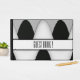 Livro de design preto e branco único com área para nome do evento e data na coluna do livro.