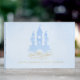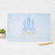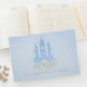 Um conto de fadas azul "Era uma vez na época", livro convidado de chá de fraldas para um menino em azul e ouro, com belos florescimentos tipográficos. O texto do roteiro diz "Era uma vez" com um castelo mágico.