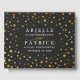 Dourado e Black Confetti Foil Foil Book Guest - apresenta um fundo preto vintage com folha de alumínio falsa dourada para decoração elegante. Este design também apresenta fontes modernas e elegantes para o layout de texto.
