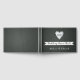 Coração de papel no quadro com um livro de hóspedes monograma, com um livro de cadernetas, adora coração com buracos no quadro. No coração há suas iniciais.