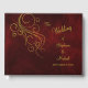Este livro de hóspedes do casamento é embelezado com uma elegante espiral de ouro na frente, com a noiva e os primeiros nomes do noivo em ouro, num fundo vermelho e arrojado. Todos os campos de texto podem ser facilmente alterados. A parte de trás do livro tem o mesmo fundo vermelho gradiente, mas sem a espiral ou o texto.