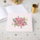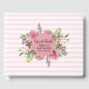 chá de fraldas bonito ou livro convidado de chá de panela com gráficos de fundo listrado horizontal, rosa e branco. A decoração floral de pénia rosa-d'água, na frente do livro, tem um disco rosa com texto personalizado. Personalize os campos de texto para seu dia especial.