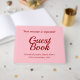 Este manual de eventos simples apresenta as mensagens "Livro de Convidados" e "A sua mensagem é solicitada!", juntamente com um nome de evento de data/ocasião personalizado. O texto tem cor vermelha escura e o fundo é cor-de-rosa. Um livro de hóspedes genérico e personalizável como este poderia ser usado em um evento como uma reunião familiar, uma festa de aniversário, uma comemoração de aniversário de casamento, um casamento, ou algum outro evento com hóspedes que talvez queiram deixar uma mensagem.