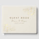 Livro de hóspedes do casamento elegante com delicados sotaques florais de ouro sobre fundo de marfim com nomes personalizados e data. Um eterno para seu dia especial — perfeito para celebrações românticas, vintage ou de casamento formal.