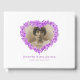 Livro de condolências funerárias ao coração floral e memórias. Simples homenagem ao livro convidado, que dá às famílias a capacidade de escrever uma homenagem por guardar e lembrar. Personalize seu livro de hóspedes com uma foto e o nome do seu amado. Flores roxas roxas-me-nots, flores pintadas à mão e design por Sarah Trett para www.mylittleeden.com