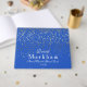 Este livro de visitas é mostrado em Azul Real com uma cortina de estrelas pequenas douradas na frente e atrás estão espalhadas por todo o livro de visitas. A frente tem texto com o seu nome personalizado em uma fonte fancy, seu sobrenome em negrito junto com a data personalizada abaixo.