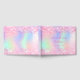 Um livro de hóspedes para uma Doce 16, 16ª festa de aniversário. Um fundo holográfico de tendência, colorido, com cores pastel unicórnio e arco-íris, cor rosa e púrpura, verde. Decorado com confete cor-de-rosa penteado. Personalize e adicione um nome, o nome é escrito com um script de estilo escrito à mão giro moderno Spine: adicione seu próprio texto.