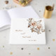 This elegant wedding guestbook features blush pink rose gold 3D roses on a white background, bride and groom name in an elegant modern font and handwritten script.