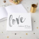 Lindo livro de visitas de casamento em branco com detalhes em prata falsa. O amor está escrito no livro de visitas de casamento branco em uma cor prateada. A fonte é um belo script pincel. Personalize com seus nomes e data de casamento em cinza prateado.