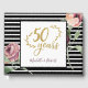 Elegante e sofisticado livro de visitas de aniversário de casamento de 50 anos com rosas vermelhas em aquarela sobre fundo listrado preto e branco. Design de texto elegante em dourado e brilho falso.
