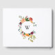 Este bonito livro de hóspedes do outono apresenta uma adorável floral de aquarela. A frente do livro de hóspedes do casamento é adornada com um grande buquê de flores de outono de rosas e dahlias em tons de burgundy, rosa-pincel, laranja queimado e marsala. Os nomes dos casais são inscritos em caracteres caligráficos abaixo do arranjo floral. No verso, um círculo de flores enquadra um monograma personalizado.