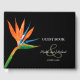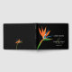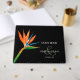 Elegante pássaro tropical do paraíso florescendo em um fundo preto acentua este livro de convidados de casamento com seus detalhes em letras quicas na frente e na coluna. CORRESPONDENDO a itens na nossa loja.