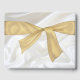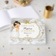 Linda menina em seu vestido batizante e colar de cruz dourado. O fundo é uma placa branca com uma estrutura dourada e cintilante prateada e um embelezamento do arco. A parte de trás é enfeitada com fita dourada sobre um fundo branco de cetim.