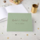 Este belo livro de convidados de casamento do tema verde é realmente adorável. Apresentando um fundo verde com uma fonte marrom. O nome do casal é apresentado em caracteres cursivos castanhos modernos, com a data do casamento em castanho. Personalize seu livro de convidados de casamento hoje!