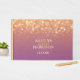 As belas bolhas gráficas de champanhe afetam casamentos no livro de hóspedes roxo e laranja ouro. Personalize com seu nome e data do casamento. Arte e design por Sarah Trett.