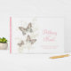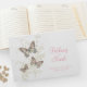 Lindas borboletas de arte com tinta e livro de hóspedes florais de rochas gráficas em rosa, creme, chalé e marrom. Personalize com seus próprios nomes e data de casamento. Tinta original de borboleta esboçada e design gráfica por Sarah Trett para www.mylittleedenweddings.com