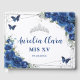 Prepare seu dia especial para os anos virem com um livro de hóspedes. Apresentando uma garota marmelada em um vestido azul real, bonito flores azuis reais e borboletas azuis e prateadas. Personalize-o com seus detalhes de forma fácil e rápida, basta pressionar o botão personalizar para reorganizar e formatar o estilo e a colocação do texto. Perfeito para 16 anos, Quinceanera, Debutante Ball, 18 anos e mais ocasiões! c) O Feliz Cat Studio
