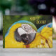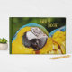 Uma bela Macaw amarela e azul brilhante olha para você. Texto na coluna para nome e data do evento.