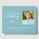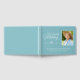 Livro de hóspedes do serviço de memória em azul claro com texto branco. Na memória amorosa escrita em uma letra branca de caligrafia. O livro de hóspedes do funeral apresenta um modelo de fotografia onde você pode adicionar sua própria foto do seu amado. Personalize escrevendo o nome e os anos de vida. A parte traseira apresenta um padrão de azulejo discreto contra um fundo azul claro.