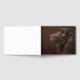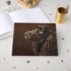 Design apresenta um retrato fotográfico de um cão com cabelo castanho sobre fundo castanho escuro.