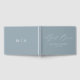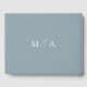 Livro de convidados elegante com "Guest Book", exibido em um moderno roteiro de caligrafia branca sobre um fundo azul empoeirado. Personalize a frente do simples livro de convidados do casamento com seus nomes e data do casamento. A parte de trás do livro de hóspedes azul empoeirado mostra as suas iniciais do monograma. Adicione seu nome casado e data de casamento à espinha do livro de hóspedes.