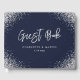 Um livro de hóspedes marinho azul e prateado com brilho prateado num fundo azul marinho. Livro de hóspedes de casamento com um título de letra moderno, perfeito para um elegante e luxuoso casamento azul e marinho. Itens correspondentes disponíveis.