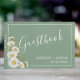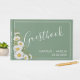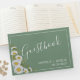 O design do guestbook de casamento bonito apresenta a cor d'água e margarida canto sobre fundo verde basilar com blocos de texto personalizáveis brancos em fontes modernas