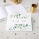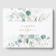 Este livro de hóspedes do casamento apresenta cor d'água eucalipto, verde botânico e folhas de ouro com guião dourado.