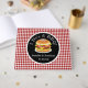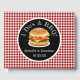 Divertido, design de casamento casual para o casamento do churrasco. Design apresenta um fundo de xadrez de gingham vermelho e branco. No centro há um círculo preto com forma branca. No centro do círculo negro está um gráfico de hambúrgueres imenso. Acima do hambúrguer está o texto em giz branco divertido como uma fonte que diz "Eu faço & CHURRASCO!" Abaixo do hambúrguer está um lugar para personalizar com os nomes dos casais e a data do casamento na mesma fonte branca. Esta é uma design de casamento tão divertida para recepção de casamento de CHURRASCO de quintal. Convites, postagens e artigos de papel também estão disponíveis para completar este tema de diversão "Eu faço" e "CHURRASCO"!