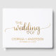 Este simples livro de hóspedes de caligrafia em ouro é perfeito para um casamento chic. O clássico design romântico apresenta uma falsa tipografia de folha de ouro e um adorável coração ouro. Personalize o cobrir com os nomes da noiva e do noivo e a data do casamento. Nota: Este design não apresenta folha de ouro real. É um gráfico de alta qualidade feito para se parecer com folhas de ouro.