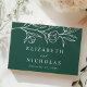 Elegante livro de hóspedes florais com flores brancas esboçadas e folhas perto do topo do design com fundo verde escuro. Personalize o livro de convidados botânicos com seus nomes e detalhes de casamento abaixo. Adicione texto personalizado à coluna, como seus nomes, data do casamento, etc. A parte de trás do livro floral de hóspedes apresenta a sua fotografia horizontal do noivado. Projetado para coordenar com a nossa coleção de casamento Floral.